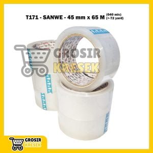 T171 Lakban Bening SANWE 45 mm x 72 yard (65 meter) 040 micron – Grosir Isolasi Plester Transparan Core Black